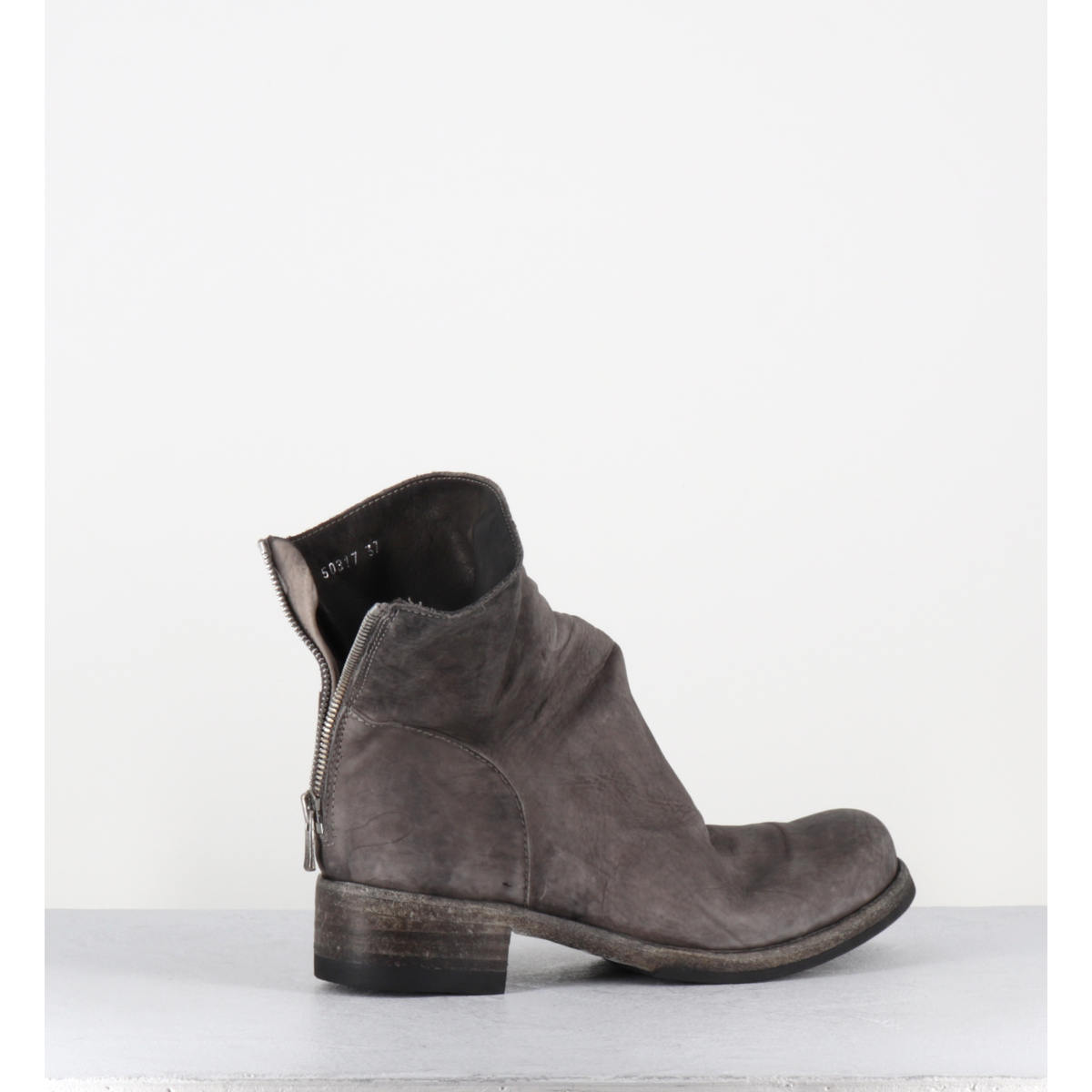 Boots en cuir gras lavé à la main pour un effet vintage, couleur gris nuancé, bout arrondi très légèrement asymétrique, zip arrière, montées sur une double semelle cousue intégral et un petit talon