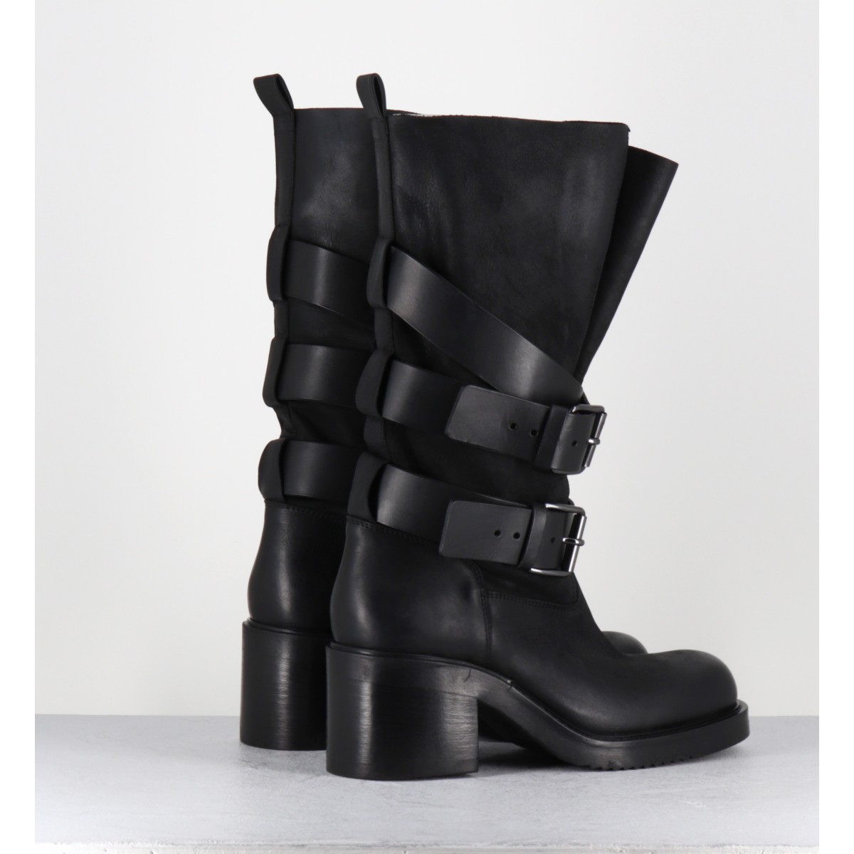 Bottes en cuir noir huilé semi doublé pour un effet souple et froissé, ligne pure esprit bikers à tige tubulaire avec double ceinturon, montées sur un talon bloc et une semelle en gomme légère