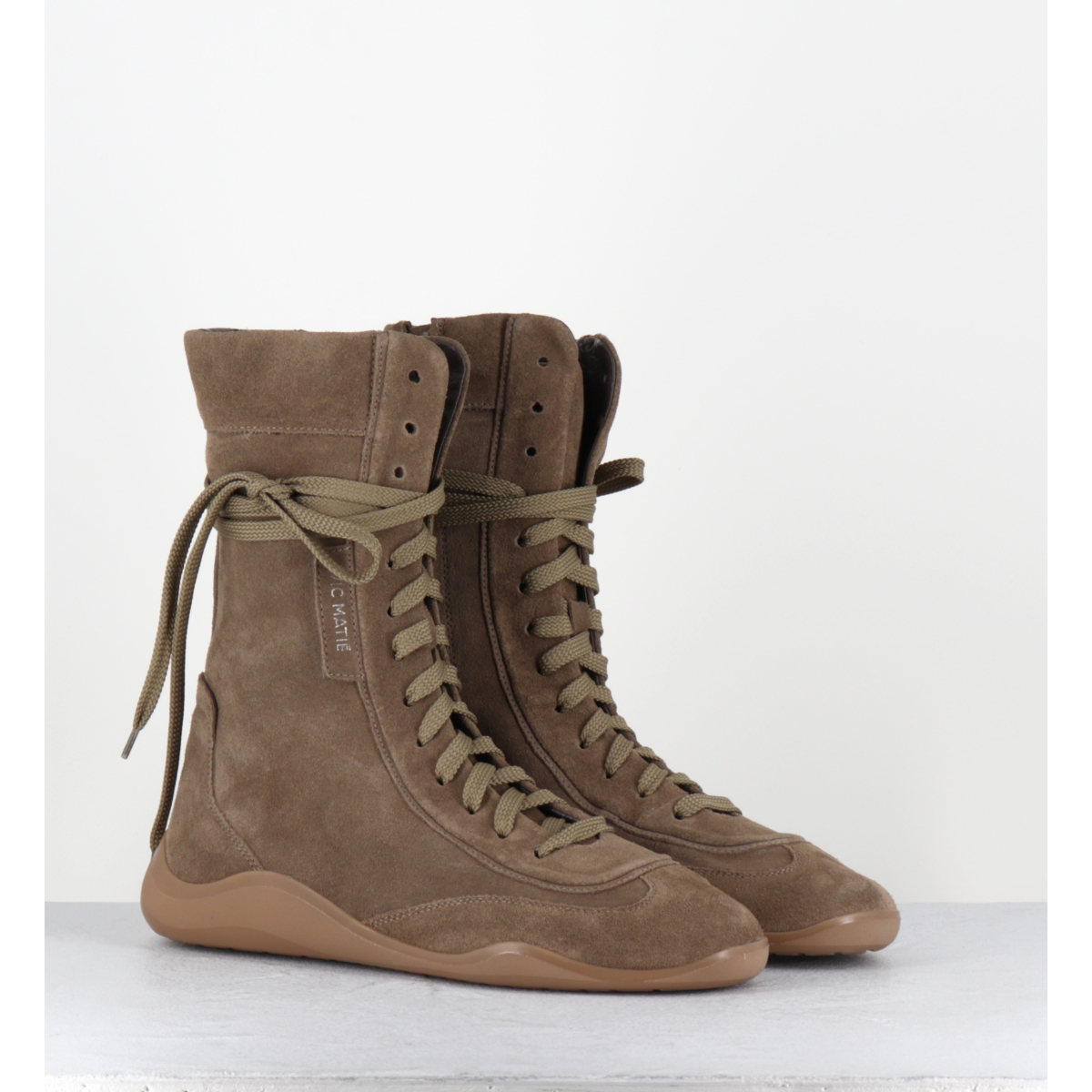 Sneakers-boots en daim taupe forme haute à lacets inspirée des chaussures de boxe, bout rond et semelle en gomme ton sur ton